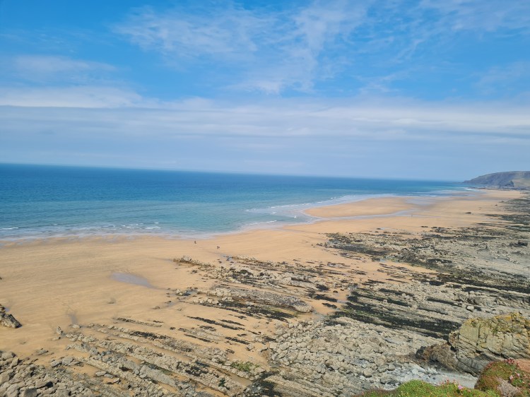 A huge sandy beach, where you can walk for miles and explore all the rockpools and cliffs.